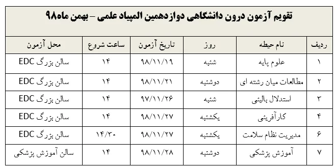 آزمون درون دانشگاهی دوازدهمین المپیاد علمی طبق جدول زیر از مورخه 19/11/98 لغایت 28/11/97 برگزار خواهد شد