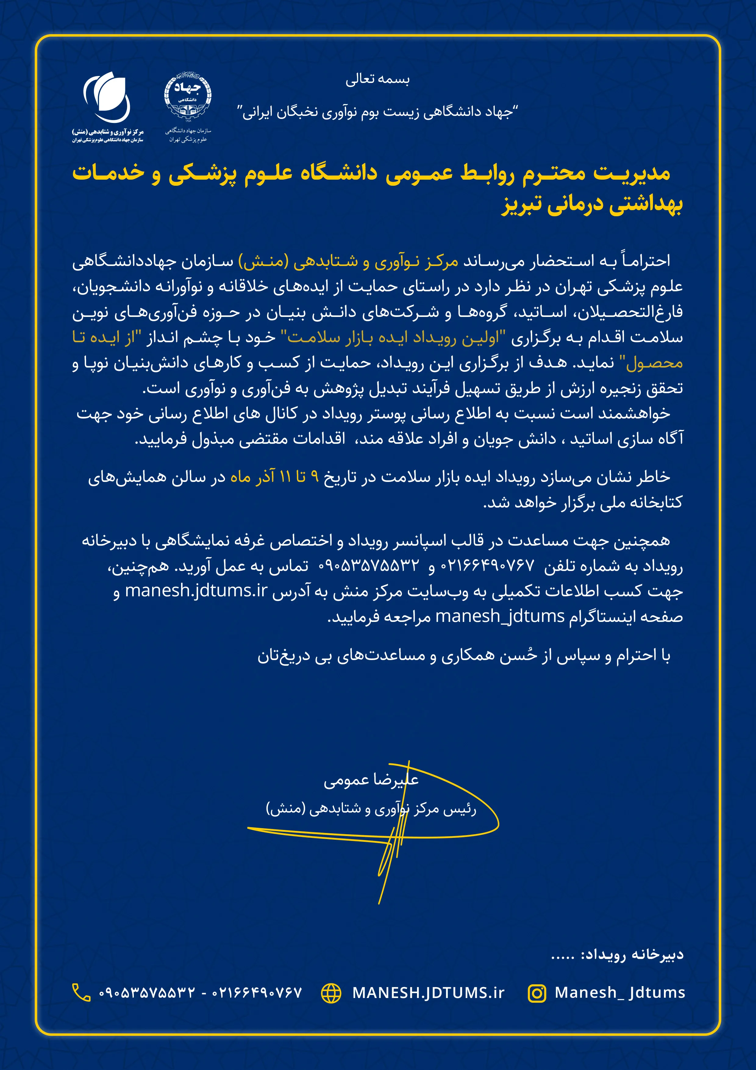 جهاد دانشگاهی علوم پزشکی تهران در نظر دارد که برای اولین بار "ایده بازار سلامت" در تاریخ 19 آذرماه برگزار نماید