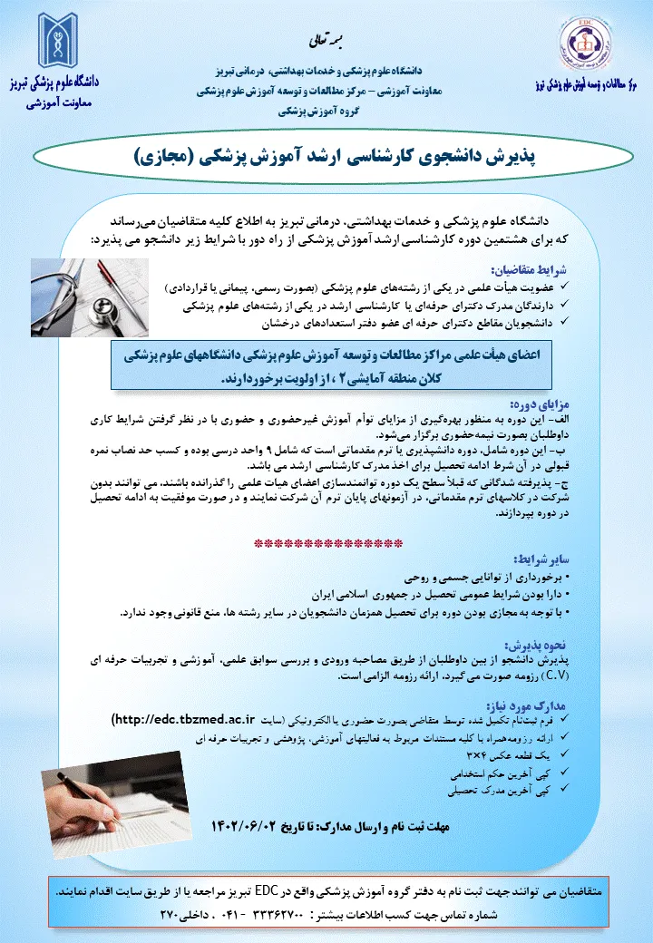 پذیرش هشتمین دوره دانشجویی کارشناسی ارشد آموزش پزشکی به صورت مجازی آغاز شد. پذیرش هشتمین دوره دانشجویی کارشناسی ارشد آموزش پزشکی به صورت مجازی آغاز شد.