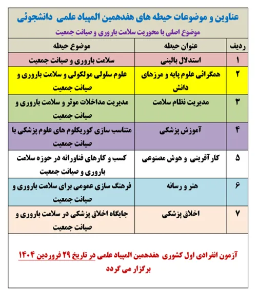 - دانشجویی که مدال طلا را در مرحله انفرادی در هر حیطه کسب نماید، نمیتواند مجدداً در همان حیطه شرکت نماید.