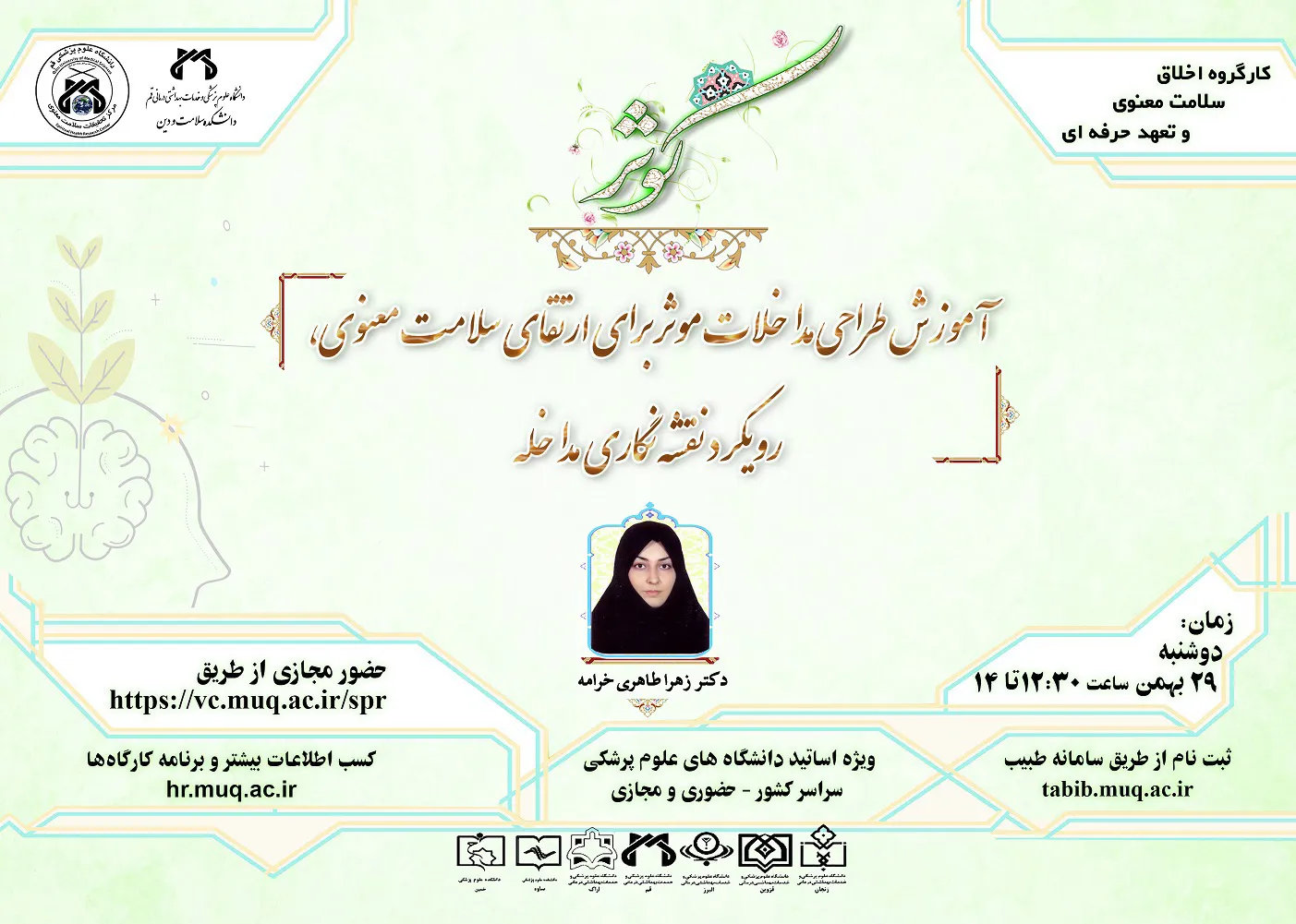 دانشکده سلامت و دین دانشگاه علوم پزشکی قم در راستای اجرای مصوبات کارگروه اخلاق، سلامت معنوی و تعهد حرفهای دانشگاه و توانمندسازی اعضای هیات علمی دانشگاهها، چهارمین برنامه از سری کارگاههای دوره آموزشی کوثر ویژه اعضای هیأت علمی دانشگاههای علوم پزشکی کشور بهویژه دانشگاههای کلان منطقه آمایشی شش ارائه می نماید: